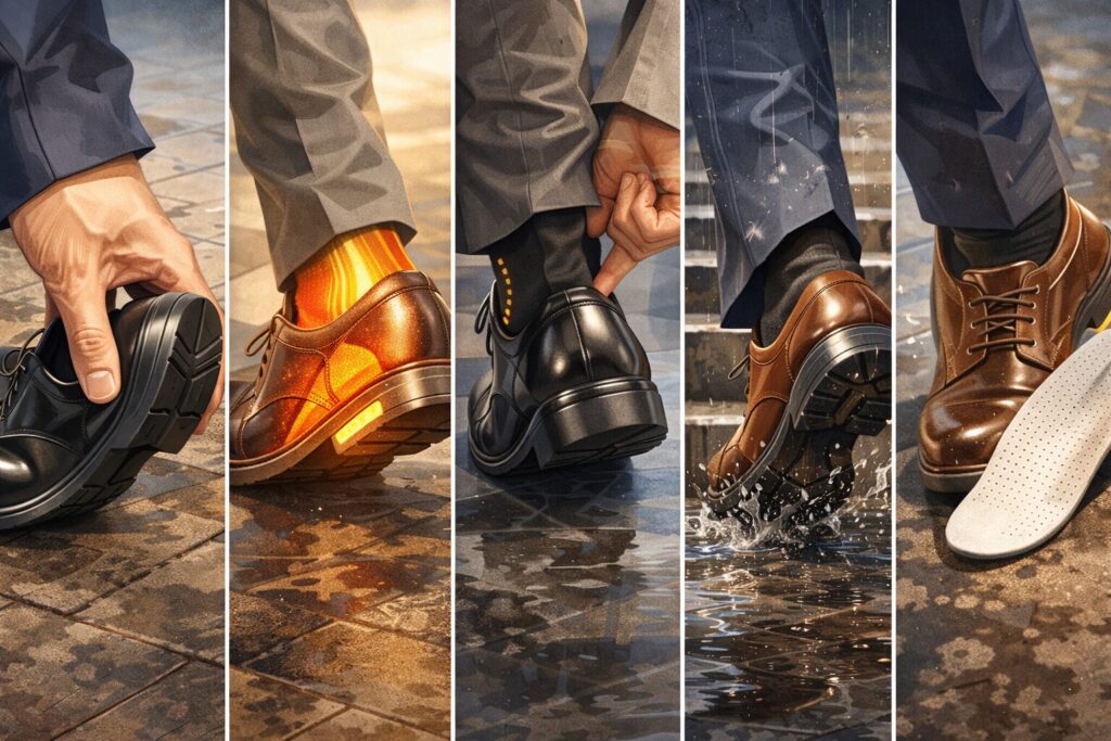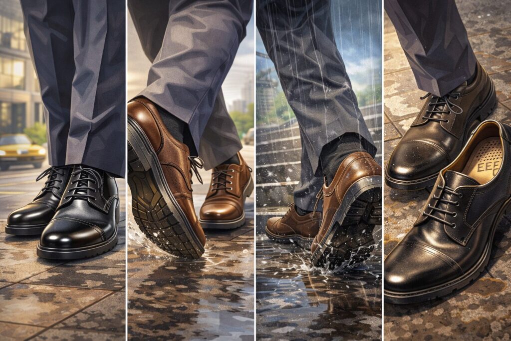 防水は水の侵入を減らし、透湿性は蒸れを減らす方向です。溝が細かく入ったソールは濡れた路面での接地を助けることがありますが、万能ではありません。雨対策を深掘りしたい場合は、雨の日に強い革靴の選び方も合わせて読むと判断しやすいです。