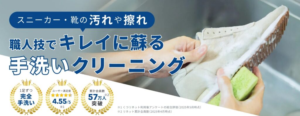 くつリネットは、職人が1足ずつ手洗いで仕上げてくれる宅配専門の靴・スニーカークリーニングサービスです。レザーやスエードを水で丸洗いし、カビ除去や染み抜きも無料で対応している点が大きな特徴です。