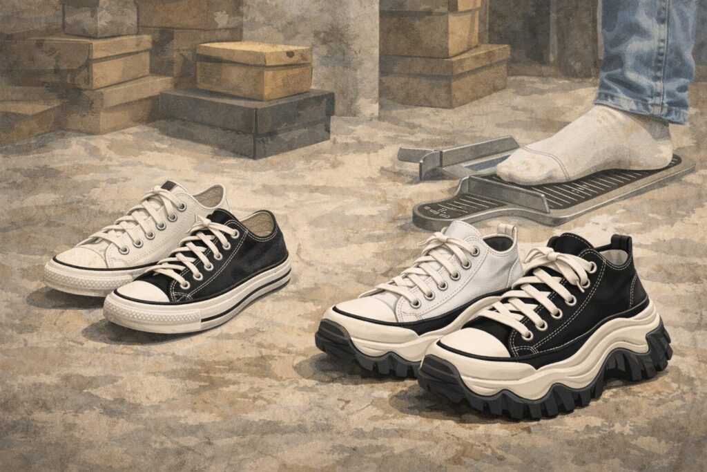 同じコンバースでも、ソールのボリュームや内部構造が変わると足入れの感覚は変わります。トレックウェーブは厚底でクッション性を意識した作りのため、定番の薄いソールを想定して選ぶと違和感が出ることがあります。