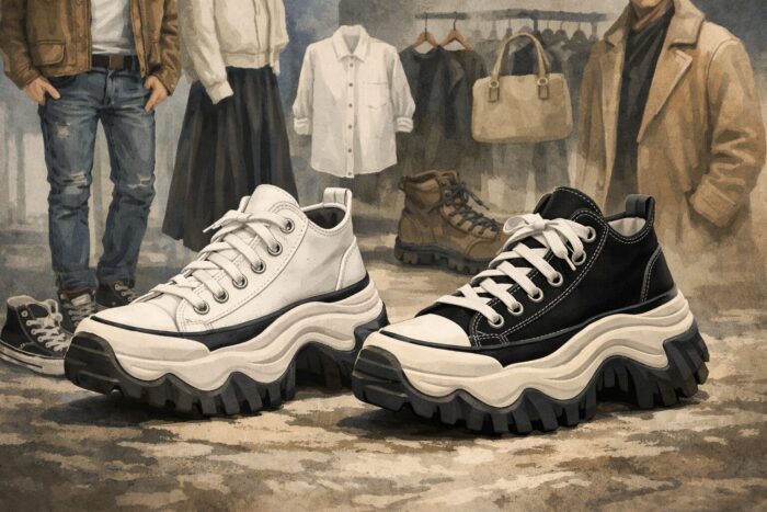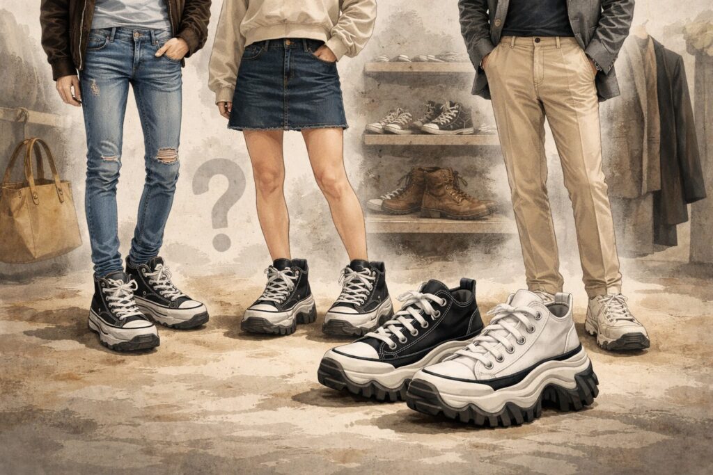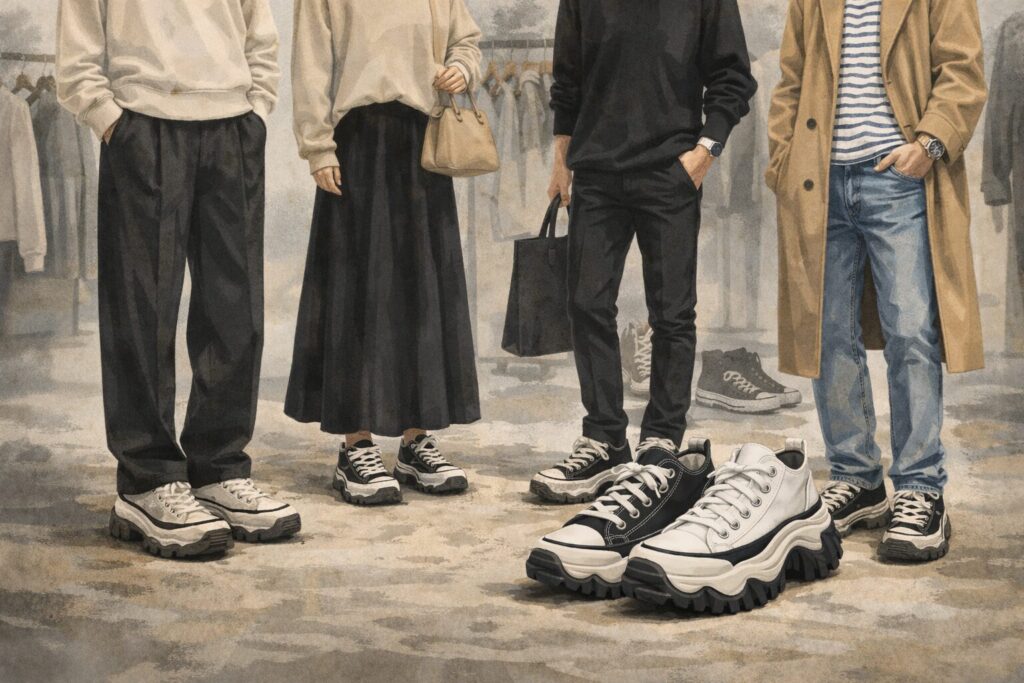足元が厚底なら、上半身にも少しだけボリュームを足すと全身の比率が揃います。大きめのトップスや中厚のアウターを使うと、靴だけが目立つ状態を避けられます。