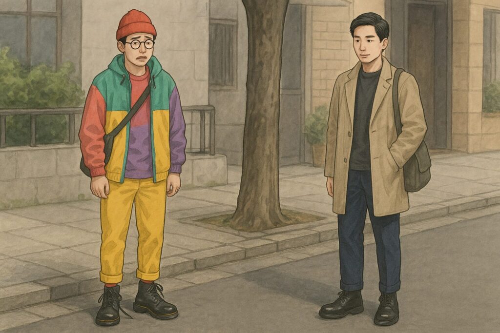多色使いでコントラストが強い装いは、ステッチやコバが効いた靴と競合し、情報過多に見えます。まずは黒やダークトーンを基調にして三色以内に抑えることが近道です。差し色を入れるなら小物で色を反復させて、靴だけが単独で目立たないようにします。