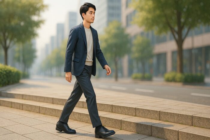 段差でつま先を引き上げる動きは、足首の可動域と重心制御を試されます。内部の高さが大きいと足関節の動きが制限され、膝や股関節で代償するため、ぎこちない足運びになりやすいです。上りで母趾球の蹴り出しが強くなり過ぎたり、下りで一段を飛ばすような不自然な間合いが続くと、観察者に違和感として残ります。