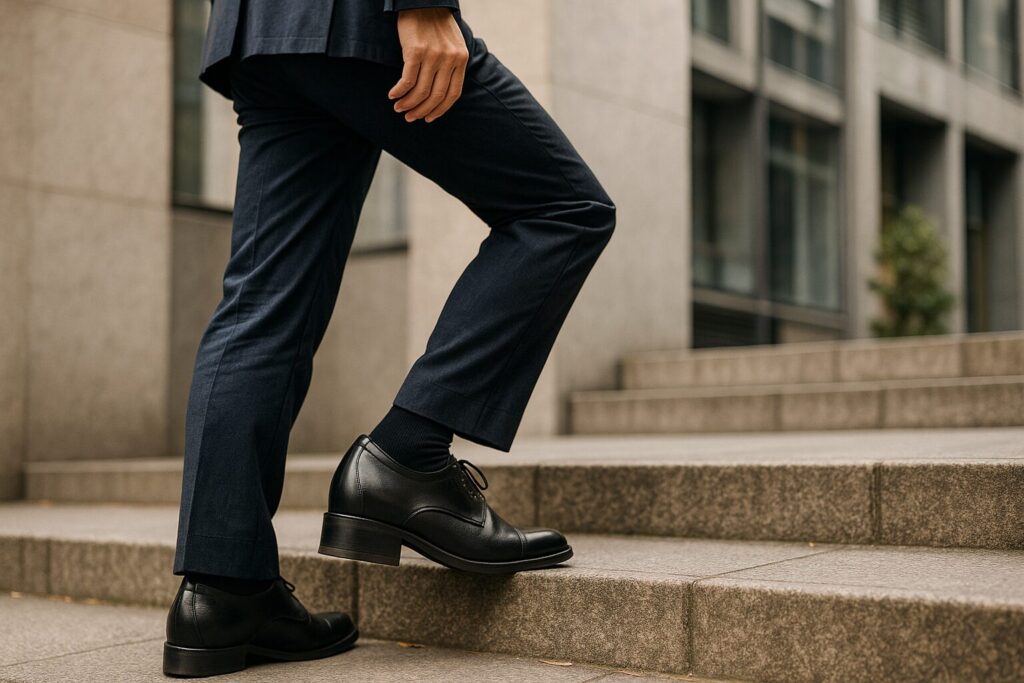 歩行距離がほどほどでTPOの自由度が高い日は4〜5センチが扱いやすい範囲です。スニーカーライクな見た目でもソールの段差が滑らかなものを選べば、雰囲気を損ねずに自然に盛れます。色はボトムと同明度で揃え、ソックスも同系にして境目を目立たせない工夫が有効です。