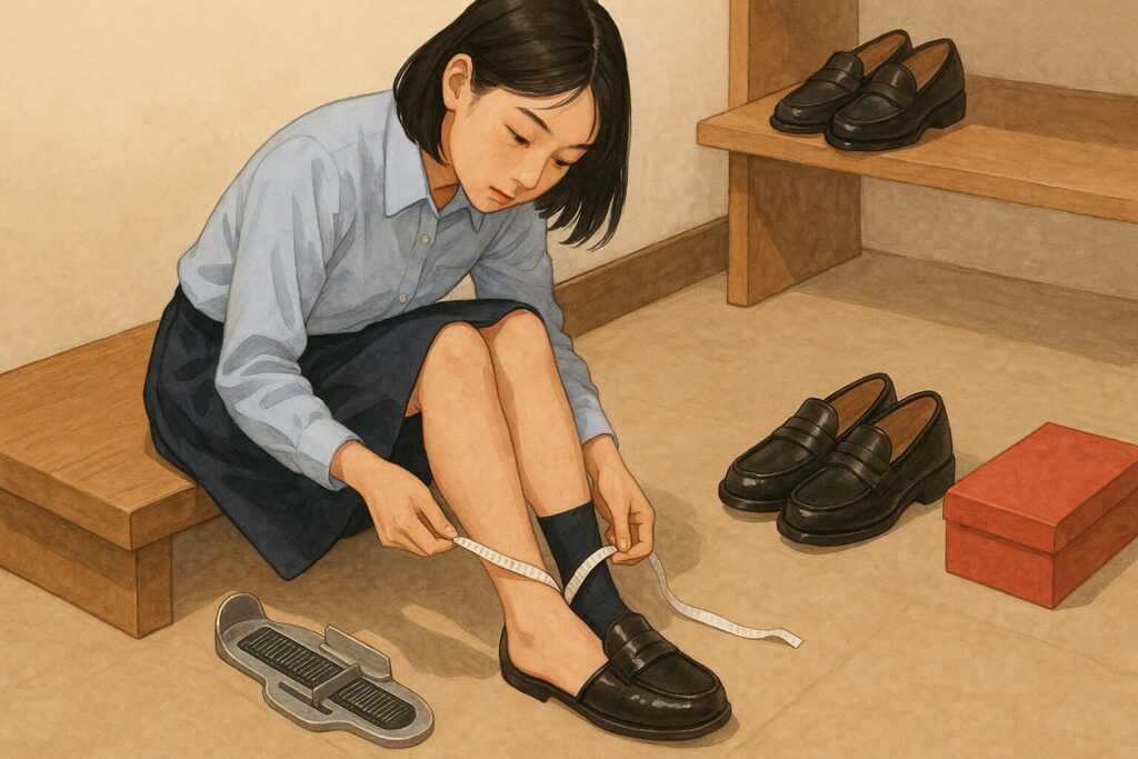 実際の選択では足長だけでなく親指付け根から小指付け根を結ぶ足囲を柔らかいメジャーで測り、サイズ表の該当範囲に当てはめます。