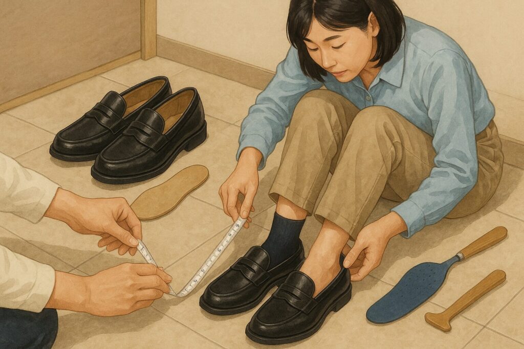 試着時は普段使いの靴下を持参し着席と立位の両方で足指の可動域を確認します。さらに、階段の上り下りで前滑りや踵浮きが出ないか、速歩で甲の圧が増えないかを確かめると、日常の動きに近い評価ができます。