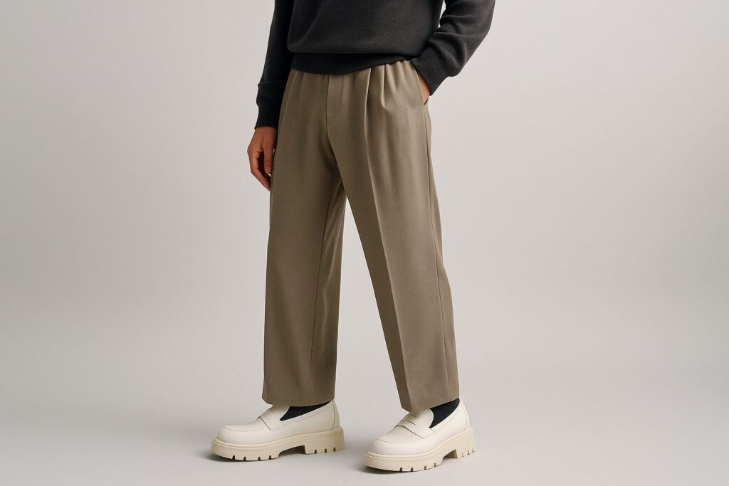 ボリュームのあるローファーやソールが強調されたスニーカーは、ボトムスの太さや丈、全身の色数によって印象が大きく変わります。