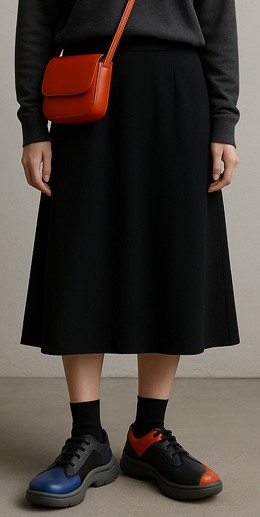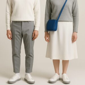 配色の強いモデルや左右非対称の意匠は、他アイテムを無地ワントーンに寄せるのが近道です。色を拾うなら、靴の一色を小物で繰り返すだけに留め、三つ以上の強色を混在させないのが安全です。素材で抜けを作りたい場合は、トップスを微起毛やドレープ素材にして光の反射を抑えると、靴の造形が際立ちます。