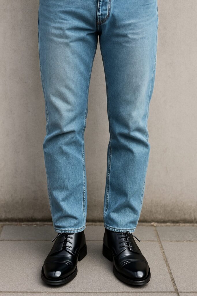 ストレートデニムはシルエットにクセが少なく、革靴との相性も幅広いのが特徴です。そのため、合わせる革靴を選びやすい反面、雑に選ぶとやや地味に見えることもあります。基本を押さえつつ、バランスを整えることが大切です。