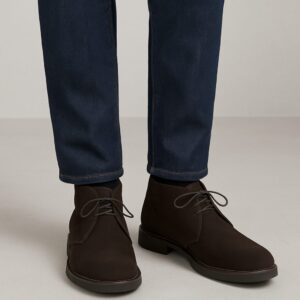 スエード素材を選ぶことで、カジュアルさと柔らかさが加わります。濃いネイビーやチャコールのジーンズには、ダークブラウンやグレーのスエードチャッカを合わせると、全体にまとまりが出て、落ち着いた大人のカジュアルに仕上がります。