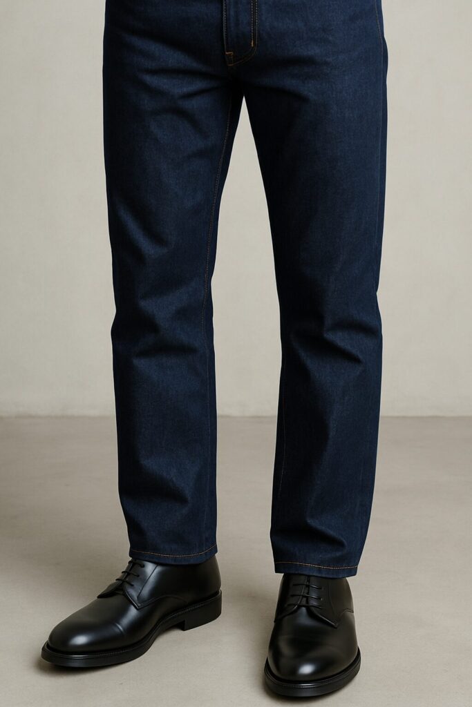 濃紺のストレートデニムに黒のプレーントゥを合わせるスタイルは、ジーンズと革靴の組み合わせにおいて最も安定感があり、失敗しづらいパターンです。清潔感ときちんと感のバランスが取れており、どんなシーンでも対応しやすいのが魅力です。