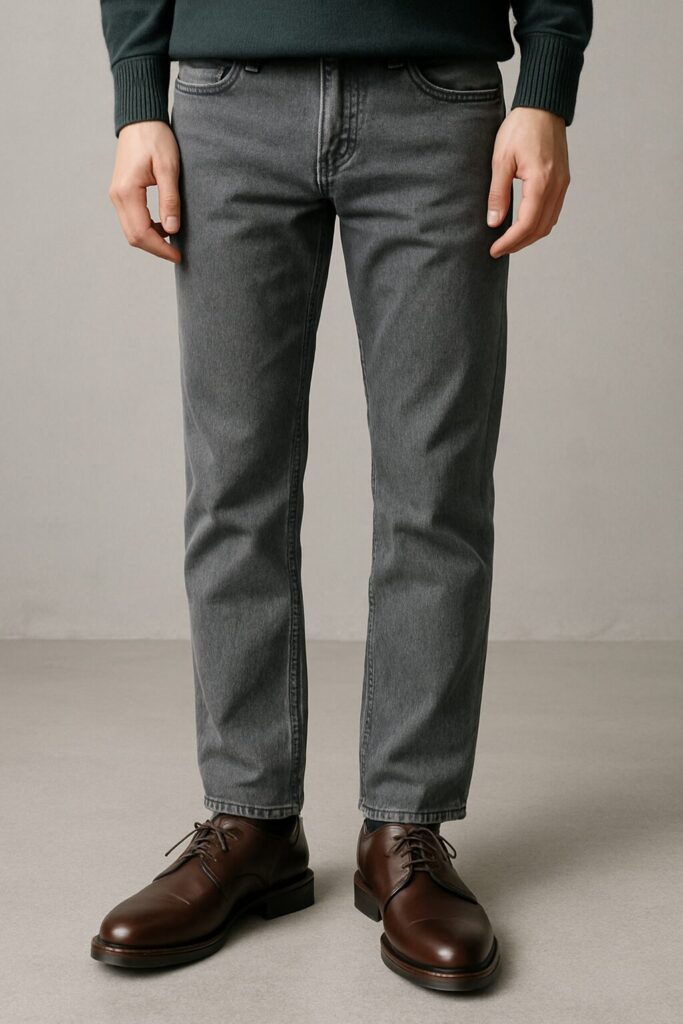グレーデニムにダークブラウンのダービーシューズを合わせるスタイルは、落ち着きと抜け感を兼ね備えた大人のカジュアルに最適です。定番のブルーデニムや黒デニムと違い、グレーはややニュアンスのある色味なので、合わせる靴の色や質感で印象が大きく変わります。