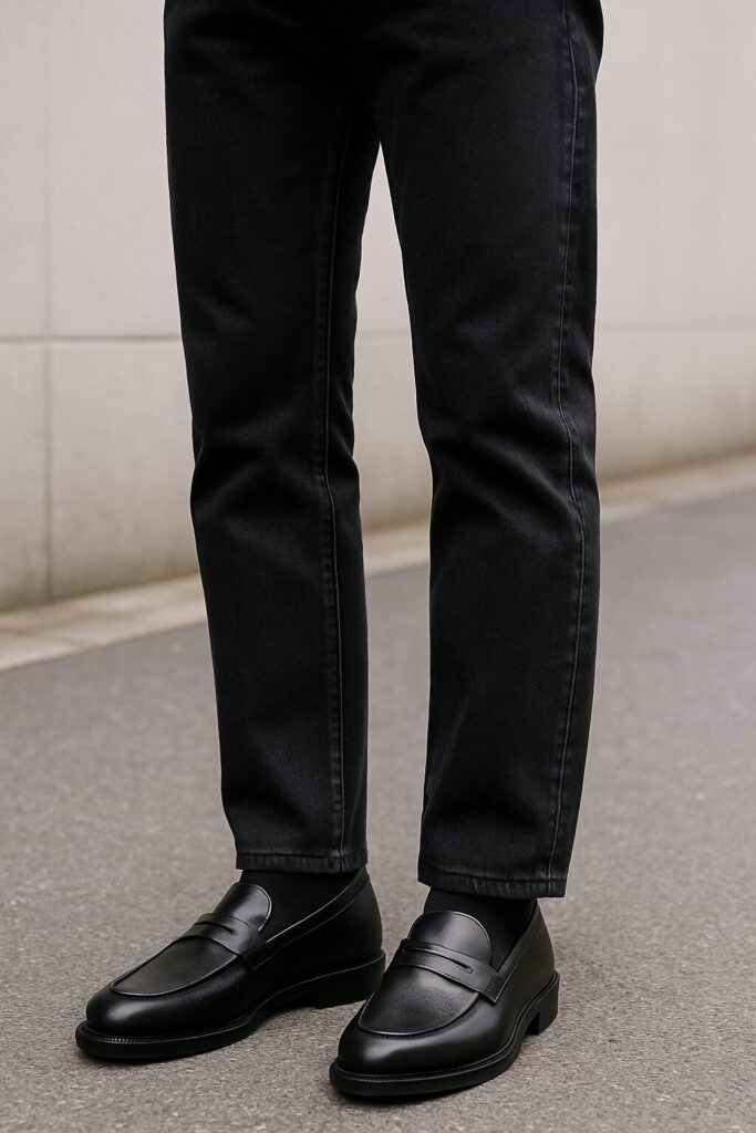 黒デニムはインディゴよりもさらに落ち着いた印象があり、スタイリング次第でモード感やクールな雰囲気を演出することが可能です。特に細身のテーパードシルエットは、ローファーのスマートな形とよく馴染みます。
