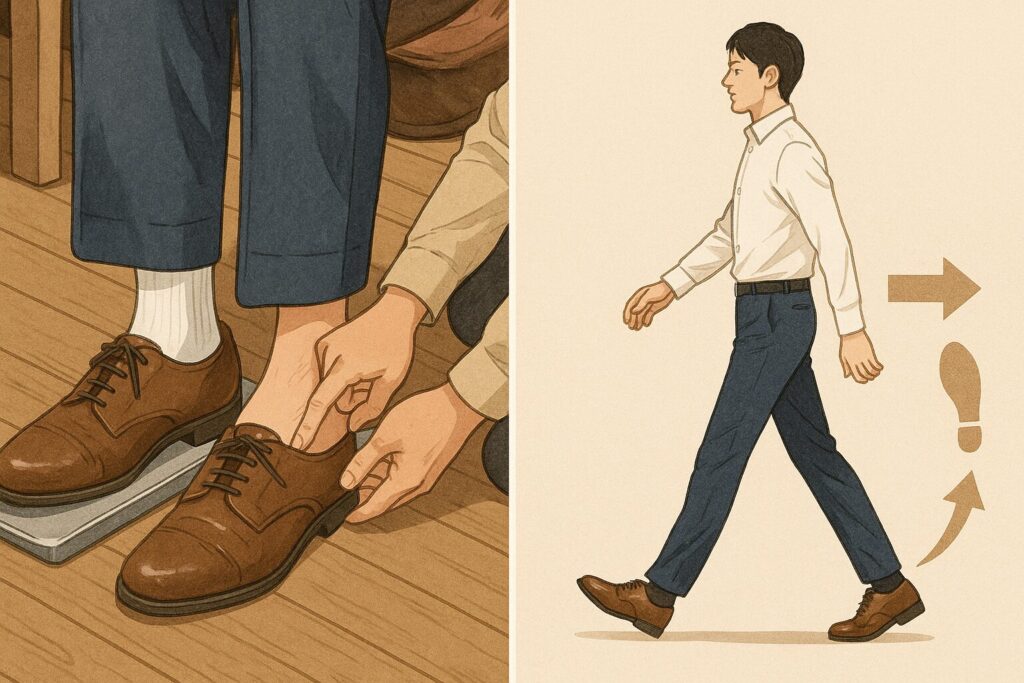 痛みの正体は、前滑りや履き口の当たり、足型と木型の不一致など複数の要因が絡み合っていることが多く、やみくもに我慢すると症状が長引きます。