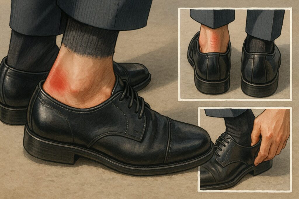 新品や硬い革、芯材が強い履き口は、当たりが鋭くなります。くるぶし周辺は皮膚が薄いので、硬いエッジが繰り返し触れるだけで赤みや水ぶくれに発展しがちです。