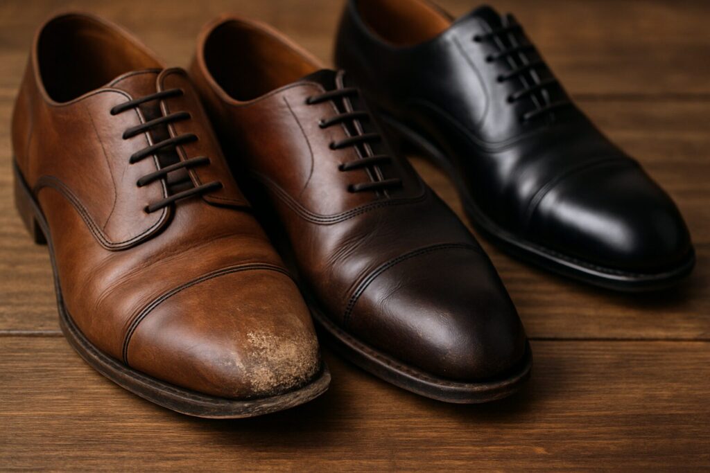 色調がわずかに合わない補修跡は、ワントーン濃い仕上げや鏡面磨きで光の反射を強めると目立ちにくくなります。ソール側の摩耗が進んだ場合は、オールソールでレザーからラバーへ仕様変更すると、グリップと耐水性が上がり通勤・悪路向きの一足に生まれ変わります。