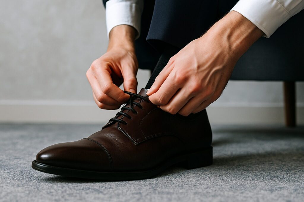 紐靴をゆるく結ぶ、着脱時に靴べらを使わない、といった習慣は足の前滑りや踵の浮きを招き、蹴り出し時に先端側へ力が集まります。羽根が平行に閉じる程度に紐を締め、靴べらで踵を潰さずに履く基本動作だけでも、つま先の局所摩耗は抑えやすくなります。