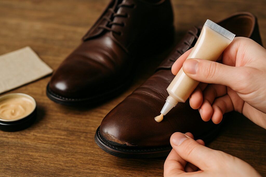 再度ごく軽く均し、レザークリームを薄くのせてブラシで整えます。艶を軽く出すと視線が分散され、補修部分が目立ちにくくなります。 - ソールのめくれ対処