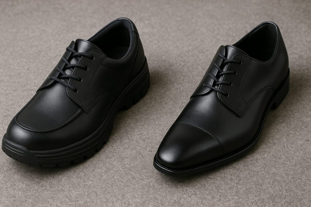 特に、つま先が細く長いドレスシューズに見慣れている人にとっては、厚めのゴムソールや丸いフォルムが、ビジネスシーンにはラフすぎると感じられることがあります。
