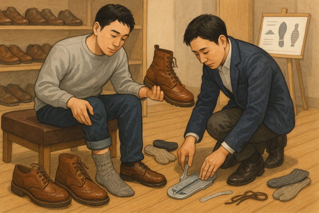 試着では踵の保持、羽根の開き約一センチ、つま先の捨て寸を同時に確認し、厚手の靴下を基準にすると馴染むまでの期間を快適に過ごせます。